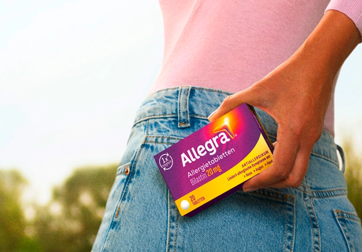 Allegra® Allergietabletten lindern Allergiesymptome, wie eine laufende oder juckende Nase, Niesen, juckende oder tränende Augen sowie Juckreiz, Rötung und Quaddel-Bildung auf der Haut.