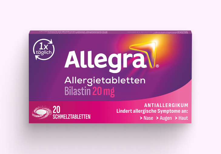Allegra® Schmelztabletten lindern schnell allergisch bedingte Symptome an Nase, Augen und Haut – in der Regel innerhalb von 30-60 Minuten. Das Antiallergikum ist praktisch für unterwegs, denn die Schmelztabletten mit Erdbeergeschmack zergehen auf der Zunge und können auch ohne Wasser eingenommen werden. Sie lindern die Allergiesymptome wirksam für 24 Stunden– mit nur einer Tablette am Tag.​